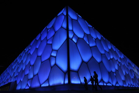 People walk outside the National Aquatics Centre, nicknamed the "Water Cube", during the Good Luck Beijing 2008 Swimming China Open in Beijing January 31, 2008. The Olympic venue for swimming, diving and synchronised swimming at the Beijing Games opened with a test event on Thursday allowing the Chinese capital's residents to ponder the ethereal cuboid structure at close range for the first time. [Agencies]