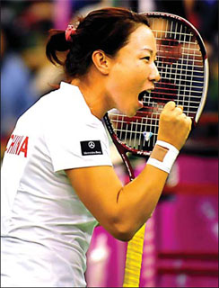 Chinese tennis doubles player Zheng Jie reacts after winning a match point with partner Yan Zi against French tennis players Nathalie Dechy and Virginie Razzano during their Fed Cup match in Beijing yesterday. Zheng and Yan won 7-5, 7-6 (5). [Agencies] |