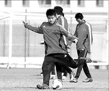 China defender Sun Xiang trains with his teammates as the national team gears up for its World Cup Asian qualifier against Iraq in Dubai tomorrow. China only qualified once for the World Cup, when it lost group matches without scoring a goal in the 2002 World Cup in South Korea and Japan. [CFP]