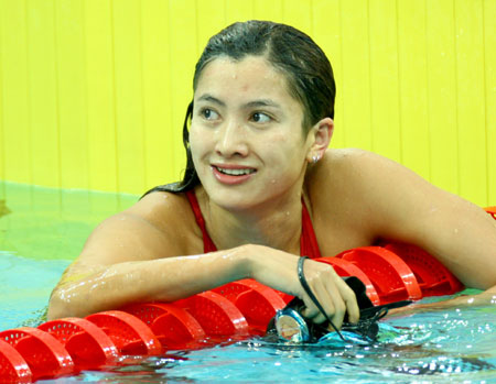 China's Chen Yanyan celebrates after winning the women's 100m backstroke at The Good Luck Beijing 2008 Swimming China Open at National Aquatics Center, nicknamed as the Water Cube February 5, 2008. [Xinhua]
