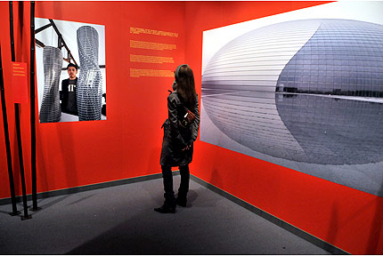 A visitor is touring a hall with the theme of "Architecture, Urbanization, and Environment". [IOC]