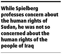 Finally, and sadly, while Spielberg professes concern about the human rights of Sudan, he was not so concerned about the human rights of the people of Iraq, where an estimated 600,000 or more people have died since the US invasion.