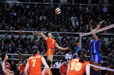 China's Yang Hao (No.3 in red) spikes against Cuba during the first match of the two sides' friendlies series in Fuzhou on Sunday. China swept Cuba 25-18, 25-22, 25-12 in only one hour or so. [Xinhua]