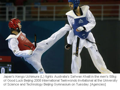 Japan's Kengo Uchimura (L) fights Australia's Safwan Khalil in the men's 58kg of Good Luck Beijing 2008 International Taekwondo Invitational Tournament at the University of Science and Technology Beijing Gymnasium in Beijing February 26, 2008. The gymnasium will hold the judo and taekwondo events in the XXIX Olympic Games in Beijing in August. [Agencies]