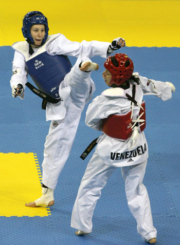 Canada's Ivett Gonda (L) fights Venezuela's Gladys Guacare in the women's 49kg division of Good Luck Beijing 2008 International Taekwondo Invitational Tournament at the University of Science and Technology Beijing Gymnasium in Beijing February 26, 2008. The gymnasium will hold the judo and taekwondo events in the XXIX Olympic Games in Beijing in August. [Agencies]