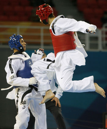 China's Wu Jinhua (R) fights Brazil's Marcio Ferreira in the men's 58kg division of Good Luck Beijing 2008 International Taekwondo Invitational Tournament at the University of Science and Technology Beijing Gymnasium in Beijing February 26, 2008. The gymnasium will hold the judo and taekwondo events in the XXIX Olympic Games in Beijing in August. [Agencies]