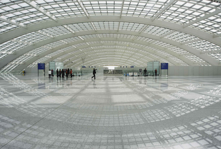 A view of the interior of Beijing International Airport's new terminal on the outskirts of Beijing February 28, 2008. In preparation for a passenger surge during the 2008 Olympics this August, the newly-built No.3 terminal building at the main airport in Beijing started operations on February 29, 2008. [Agencies] |