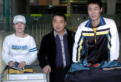 China's table tennis veterans Wang Nan (L) and Wang Liqin (R) walk out of the rail station in Hong Kong with men's team coach Liu Guoliang, March 3, 2008. [Xinhua]