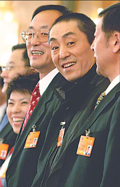 Movie director Zhang Yimou (second from right) attends a press conference in Beijing, March 12, 2008. [China Daily]