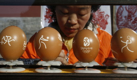 A woman carves egg shells with the Beijing Olympic theme as part of a campaign to promote the Olympic Games in Xuanwu district of Beijing, March 13, 2008. The Chinese capital is gearing up for China's biggest event of the year, the Olympic Games which opens on August 8, 2008. Eggshell carving is a popular folk art in China. [Agencies]
