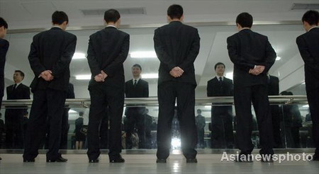 Prospective flight attendants practice smiling during a training session in Chengdu, Southwest China's Sichuan Province, March 19, 2008. Air China, the official carrier of the Beijing Olympic Games, started to train the first batch of 34 candidates during a nationwide selection of flight attendants for flights during the Games. [Asianewsphoto]