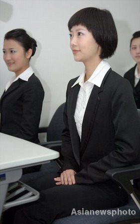 Prospective flight attendants learn the proper sitting posture during a training session in Chengdu, Southwest China's Sichuan Province, March 19, 2008. Air China, the official carrier of the Beijing Olympic Games, started training the first batch of 34 candidates during a nationwide selection for service during the Games. [Asianewsphoto]