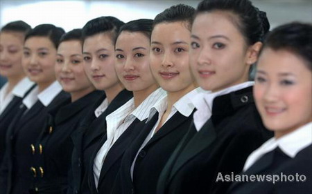 Prospective flight attendants practice smiling during a training session in Chengdu, Southwest China's Sichuan Province, March 19, 2008. Air China, the official carrier of the Beijing Olympic Games, started to train the first batch of 34 candidates during a nationwide selection of flight attendants for flights during the Games. [Asianewsphoto]