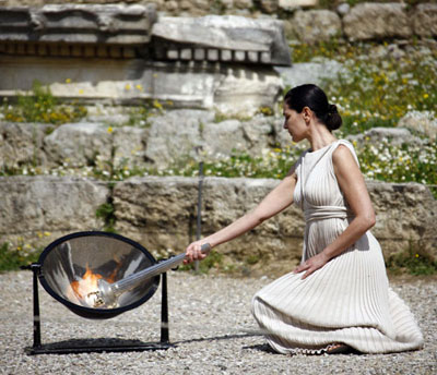 The "Highest Priestess" of the ceremony, played by Greek actress Maria Nafpliotou, lit the Olympic torch with a flame from an ancient Greek pot. The flame had been lit by sun rays during a rehearsal on March 20 in front of the ruins of the Temple of Hera.