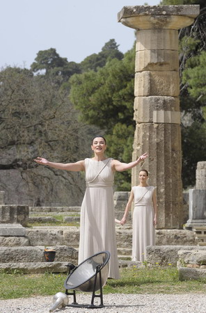 Maria Nafpliotou, the High Priestess is at the Flame-lighting Ceremony for the Beijing 2008 Olympic Games in ancient Olympia, Greek March 24, 2008. [Xinhua]