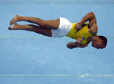 Diego Hypolito of Brazil performs on the floor during the all-around team competition at the 40th World Artistic Gymnastics Championships in Stuttgart in this September 3, 2007 file photo. [Agencies] |