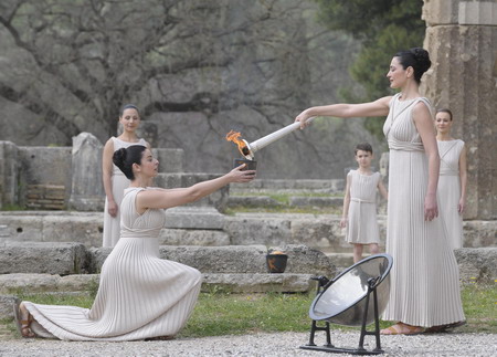 Greek actress Maria Nafpliotou (R, front), lights the Olympic flame for the 2008 Beijing Olympic Games at the site of ancient Olympia in Greece March 24, 2008. [Xinhua] Clicke for more photos
