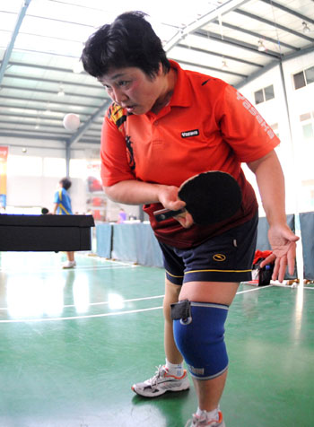 Zhang Xiaoling, five-time Paralympics champion of table tennis trains in Xi'an of Northwest China's Shaaxi Province, March 25, 2008. Zhang has competed in five consecutive Paralympics and won ten gold medals in total. She will compete in her sixth Paralympics in Beijing in August. [Xinhua]