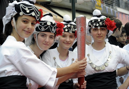 Girls in ethnic costume take a photo with an Olympic torch in Giannitsa of Greece March 27, 2008. The Olympic flame travelled in six cities in north Greece in its fourth day relay. [Xinhua]