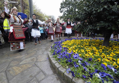 Residents of Edessa City in Greece hold a ceremony for the arrival of Olympic torch March 27, 2008. The Olympic flame travelled in six cities in north Greece in its fourth day relay. [Xinhua]