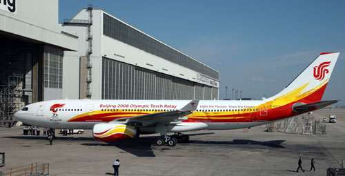 The Olympic Torch plane is parked at Beijing Capital International Airport March 27, 2008. [Xinhua]