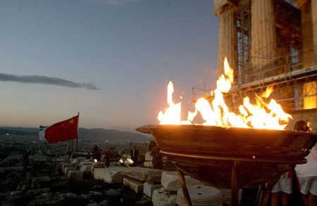 The sacred flame of the Olympics reached the acropolis at Athens March 29, 2008. [Xinhua]