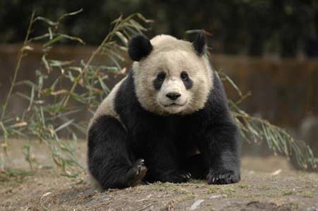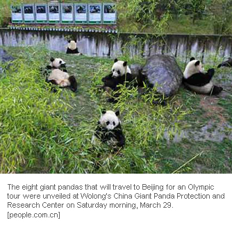 The male giant panda winner, Taotao. The eight giant pandas that will travel to Beijing for an Olympic tour were unveiled at Wolong's China Giant Panda Protection and Research Center on Saturday morning, March 29. The pandas, the winners of an online poll, will stay in Beijing for six months beginning this May. [people.com.cn]
