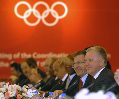 Hein Verbruggen (R), chairman of the International Olympic Committee (IOC) Coordination Commission for the Beijing 2008 Olympic Games, attends the opening of the IOC meeting in Beijing April 1, 2008. [Agencies]