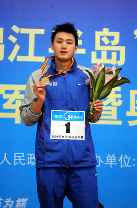 Zhang Lin poses with his gold medal on the podium after winning the men's 200m freestyle final at the National Swimming Championships in Shaoxing of east China's Zhejiang Province April 1, 2008. [Xinhua]