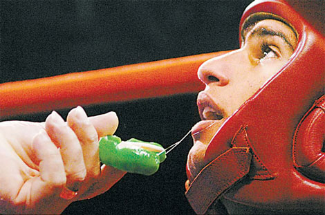 Britain's Amir Khan, 17, rests between rounds against Mario Cesar Kindelan Mesa of Cuba during their lightweight boxing match in Athens, 2004. Khan took silver, Britain's sole boxing medal at the Games. [Agencies]