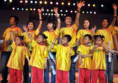 Ambassadors to the Games Volunteers, the Fu quintuplets wear cheerleading uniforms celebrating the official launch of the uniform for the Beijing Olympic and Paralympic cheerleaders, in Beijing, April 10, 2008. [Xinhua]