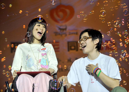 Former gymnast Sang Lan, who is paralyzed from the chest down after an accident during a vault warm-up in 1998, sings a song with a college student at a ceremony officially launching the uniform and mascot for the Beijing Olympic and Paralympic cheerleaders, in Beijing, April 10, 2008. [Xinhua]