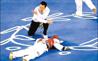 One of the key decisions at the Athens Olympics was when Chinese referee Zhao Lei stopped the fight as Bertrand Gbongou Liango of the Central African Republic (right) was lying on the ground after receiving a reverse kick in the head by Tuncay Caliskan of Austria at the end of their under -68kg round of 16 taekwondo match on August 27.