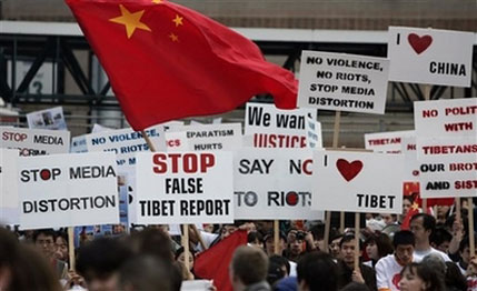 Overseas Chinese students demonstrate at the University of Washington, April 14, 2008 in Seattle. Overseas Chinese held rallies around the world Sunday and Monday to voice their support for the Beijing Olympic Games and anger at Tibetan separatists' violence in Lhasa. [Agencies]