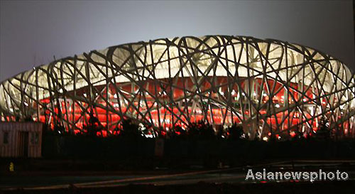 The National Stadium of China, also known as the Bird's Nest and the main venue holding the opening ceremony of the 2008 Olympics, conducts lighting tests in Beijing, April 13, 2008. [Asianewsphoto]