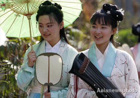 Fans of Hanfu, the clothing style from the Han dynasty, go for a stroll near Shichahai to take in the spring scenery in Beijing, April 13, 2008. [Asianewsphoto]