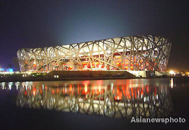 The National Stadium, or "Bird's Nest", is lit in colors at night and reflected in the water in Beijing, April 14, 2008.  [Asianewsphoto]