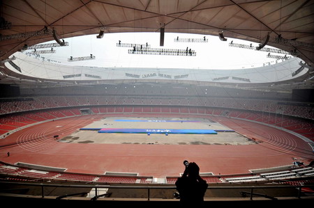A photographer takes photos inside the National Stadium, also known as the Bird's Nest, in Beijing April 16, 2008. The stadium will host the Good Luck Beijing Race Walking Challenge on Thursday, the first event to be held at the 2008 Beijing Olympic Games athletics stadium. [Xinhua]