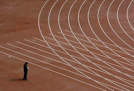 A policeman stands next to the lines marking the lanes for the athletics track at the National Stadium, also known as the Bird's Nest, in Beijing April 16, 2008. The stadium will host the Good Luck Beijing Race Walking Challenge on Thursday, the first event to be held at the 2008 Beijing Olympic Games athletics stadium. [Agencies]