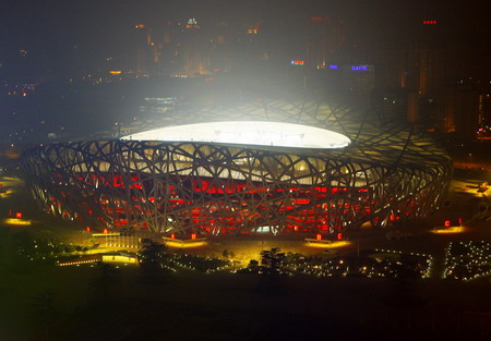 The National Stadium, also known as the "Bird's Nest," is seen lit at night in Beijing April 15, 2008. The main venue for the Beijing Olympic Games, the National Stadium will be open to the public for the first time for the Good Luck Beijing Race-Walking Challenge which will take place from April 18 to 19. [Xinhua]