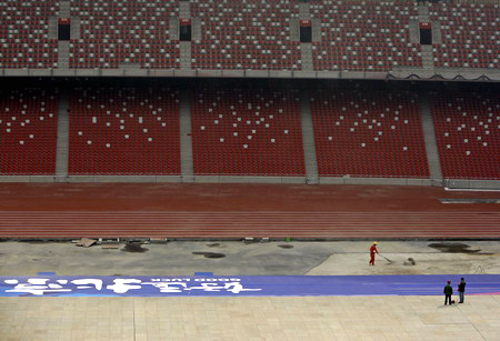 Workers make final preparations at the National Stadium, also known as the Bird's Nest, in Beijing April 16, 2008. The stadium will host the Good Luck Beijing Race Walking Challenge on Thursday, the first event to be held at the 2008 Beijing Olympic Games athletics stadium. [Agencies]