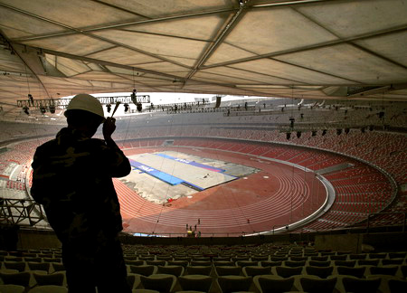 A worker makes final preparations at the National Stadium, also known as the Bird's Nest, in Beijing April 16, 2008. The stadium will host the Good Luck Beijing Race Walking Challenge on Thursday, the first event to be held at the 2008 Beijing Olympic Games athletics stadium. [Agencies]