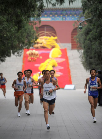 Serod Batochir of Mongolia (front) runs past the Temple of Heaven during the Good Luck Beijing 2008 marathon men's race, April 20, 2008. Batochir won the first title, followed by Li Zhuhong and Han Gang from China. [Xinhua]