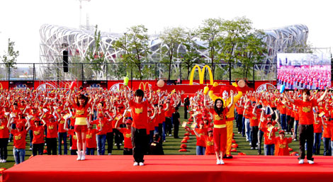 The students took part in a cheerleading dance opposite the National Stadium in the afternoon, chanting one of the chain's most recognizable slogans mixed with national fervor for local athletes as they shouted "China wins, I'm lovin' it."