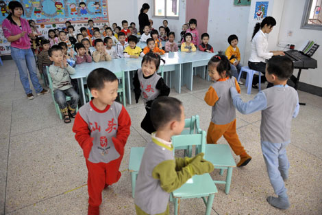 The Lin quintuplets play a game in a kindergarten classroom in Shantou, Guangdong, April 24, 2008. The five 6-year-olds will perform at the opening ceremony for the Beijing Olympic torch relay in the city, which will begin on May 10, 2008. [Xinhua] |