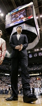 Houston Rockets Yao Ming, of China, stands on the court with his foot in a boot prior to the start of Game 4 of the NBA basketball playoff series Saturday, April 26, 2008, in Salt Lake City. [Agencies]