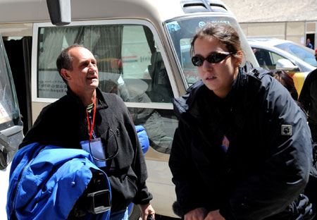 Two German journalists arrive at the Mt. Qomolangma media center April 28, 2008, for covering the ascent of the Beijing Olympic flame to the world's highest peak. [Xinhua] |
