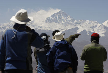 Foreign and local journalists look from an observation point at Mt. Qomolangma, also known as Mt. Everest in the West, April 28, 2008. Thirty reporters, including 11 foreigners, reached the Mt. Qomolangma media center Monday for covering the ascent of the Beijing Olympic flame to the world's highest peak. [Agencies] |