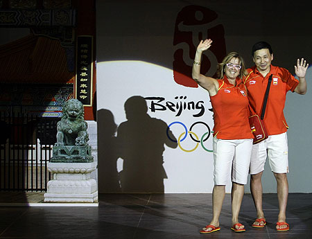 Spain's table tennis player Juanito (R) and synchronized swimming trainer Anna Tarres wave during the presentation of Spain's official Olympic uniform in Madrid April 28, 2008. [Agencies]