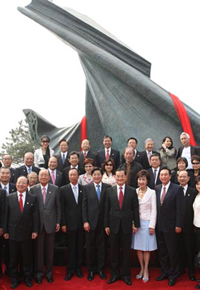 Participants pose for a group photo after the ceremony for installing a sculpture presented by Lien Chan near the National Aquatics Center dubbed the "Water Cube", in Beijing, capital of China, April 29, 2008. [Xinhua]